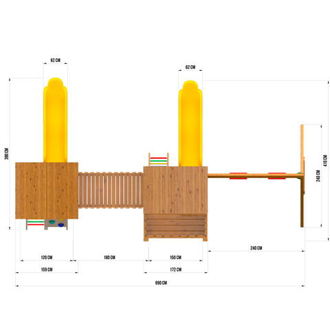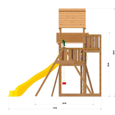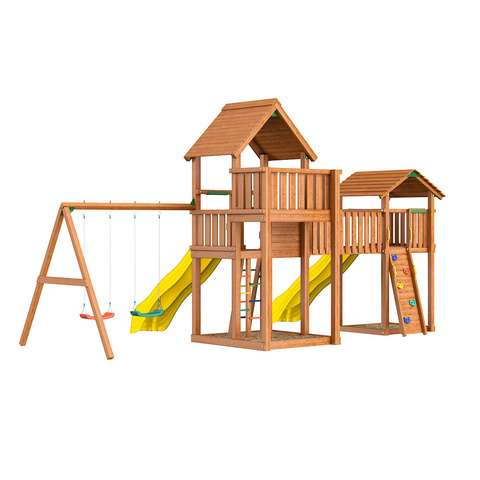 жесткий мост, S-образные горки, качели. Древесина обработана гипоаллергенной краской, что защищает ее от внешних негативных факторов и вредителей.