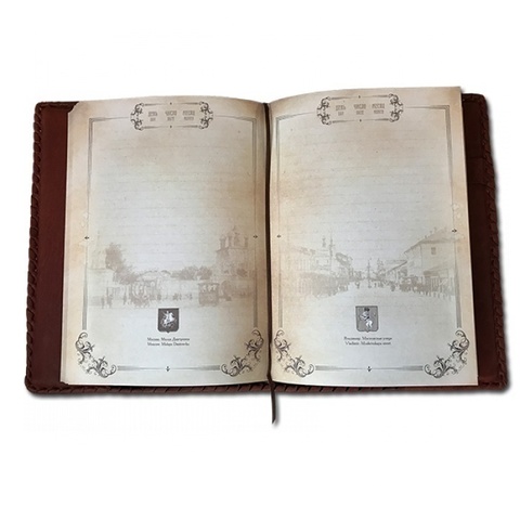 В качестве фона использовались фотографии 19 века с видами улиц городов России. Содержит информацию мер длин, объема и веса, которые были в 19 века, табель о рангах, как назывались родственники по кровной линии, название и описание денежных знаков России 19 века, Таблица соответствии букв с числами, Кириллица и Глаголица, Правила написания чисел римскими цифрами и телефонная книга. Блок ежедневника изготовлен из плотной дизайнерской бумаги, подходящей для использования перьевых ручек.
