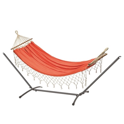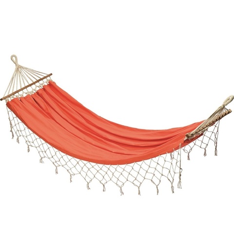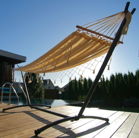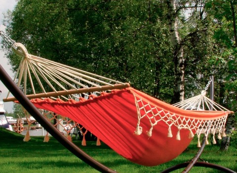 Яркий красивый гамак TANGO сделан из высококачественного хлопка, мягкая фактура материала прекрасно адаптируется к форме вашего тела, полотно гамака украшено небольшой изящной бахромой натурального цвета.