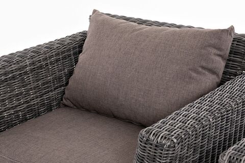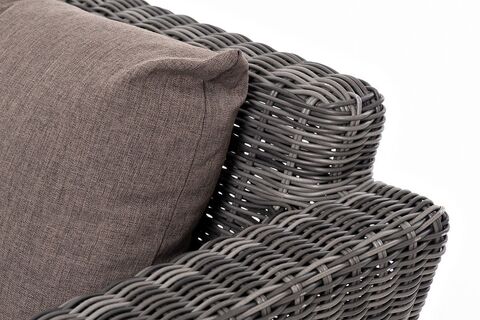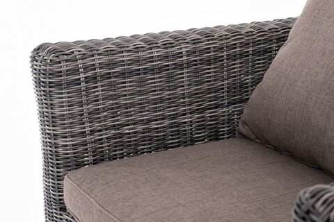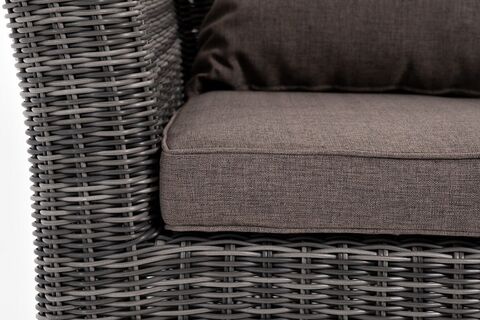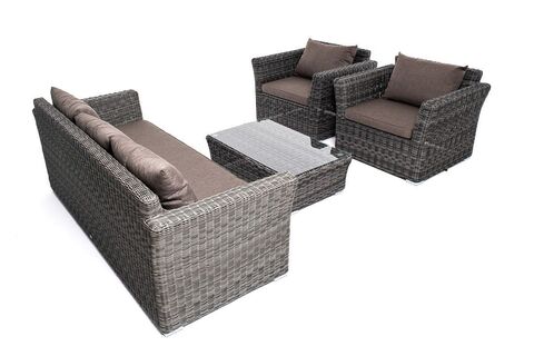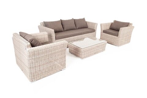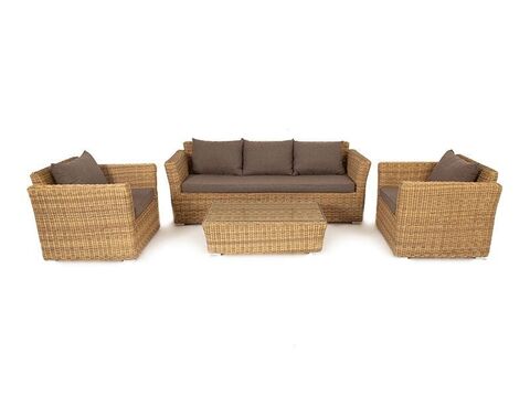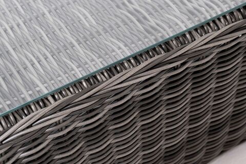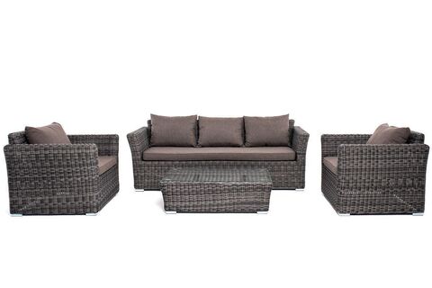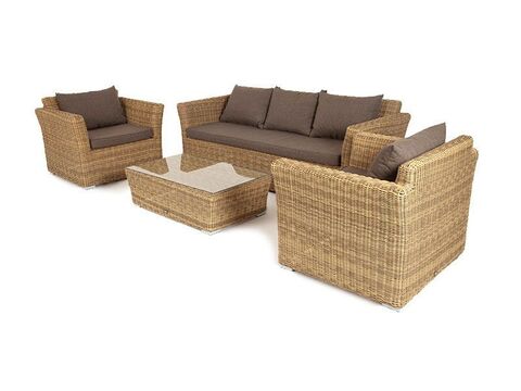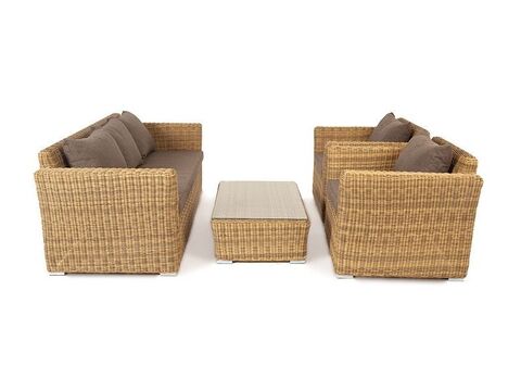 Лаунж зона на 5 персон. 1 трехместный диван, 2 кресла, журнальный столик со стеклянной столешницей толщиной 5 мм. Искусственный ротанг, круглое плетение, алюминиевый каркас.
