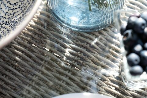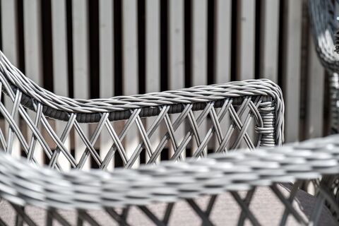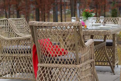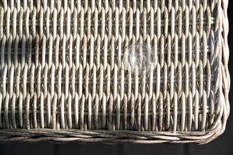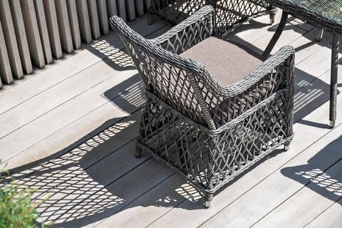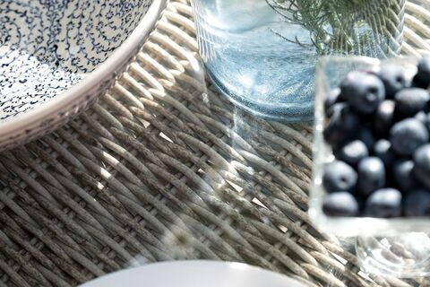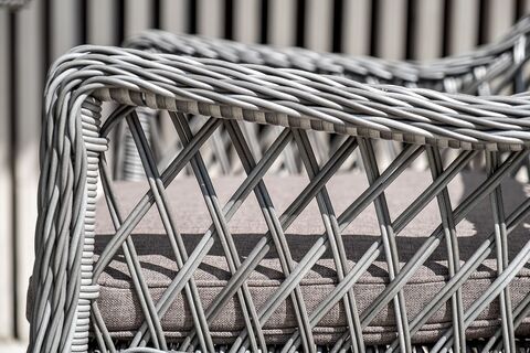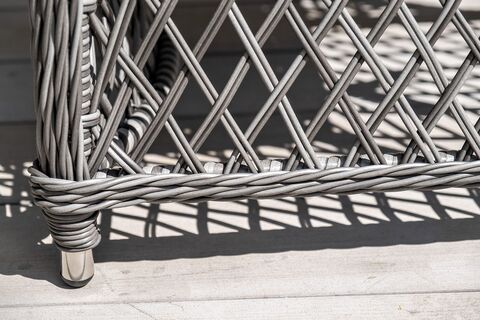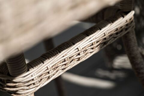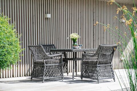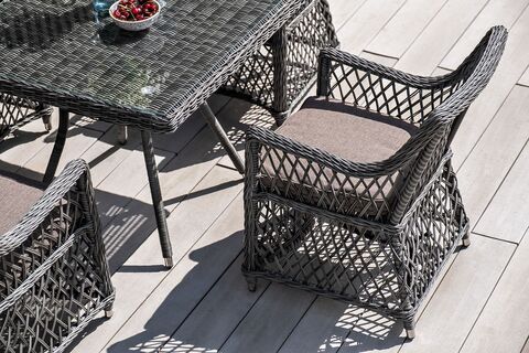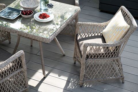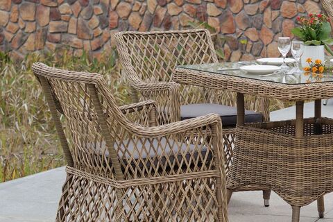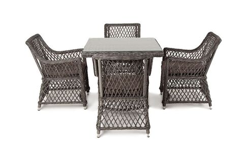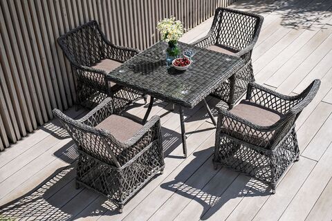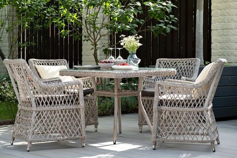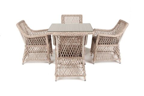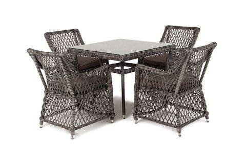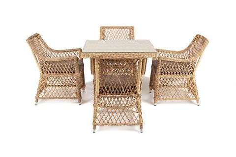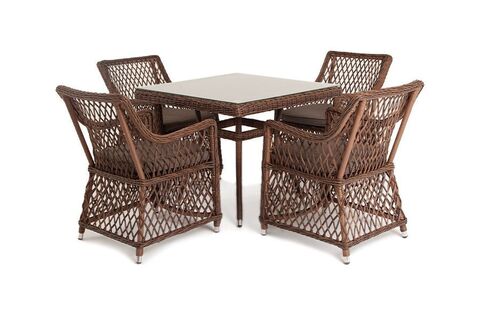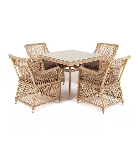 Обеденная группа из искусственного ротанга: 1 квадратный обеденный стол со стеклянной столешницей, 4 кресла. Алюминиевый каркас, круглый искусственный ротанг, ручное плетение. Кресла оснащены подушками со съемными чехлами.