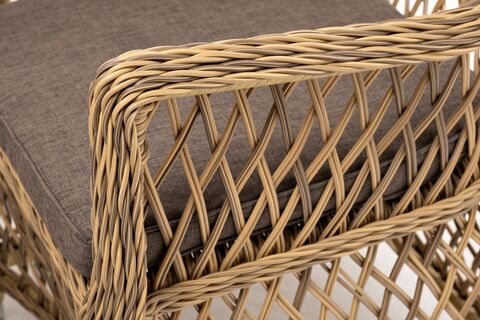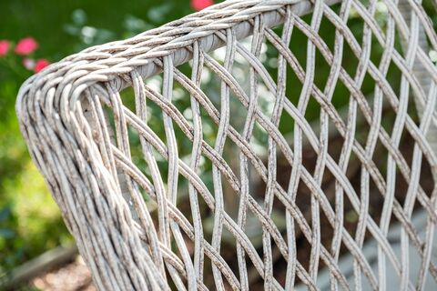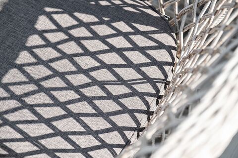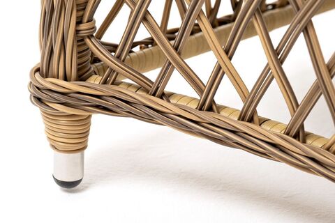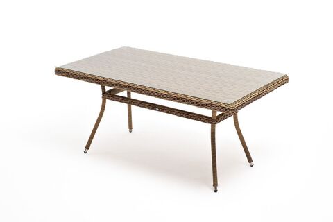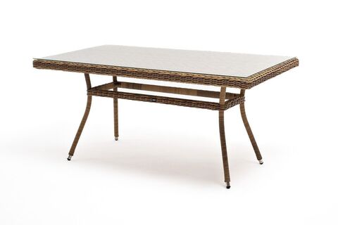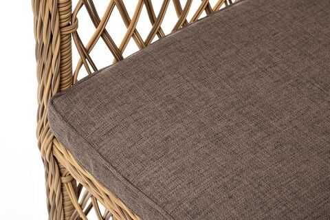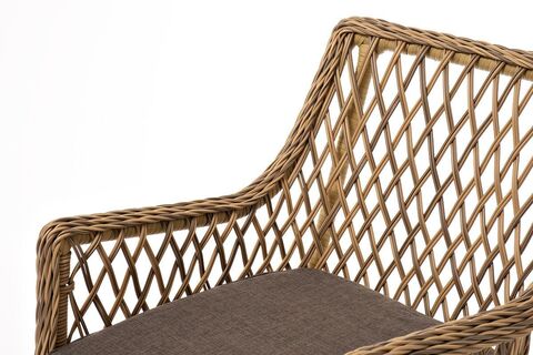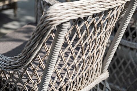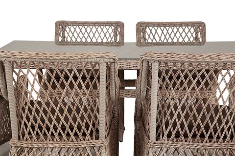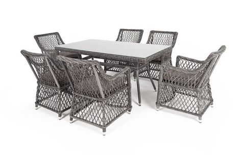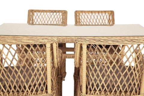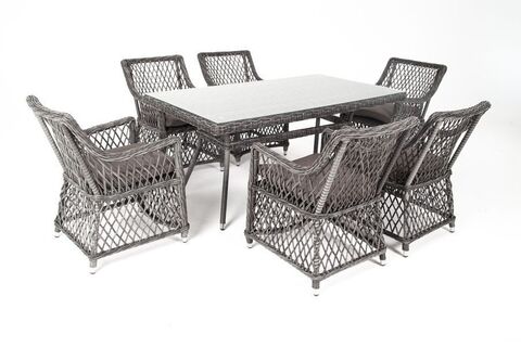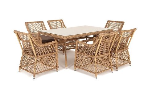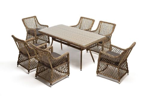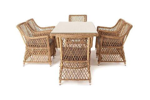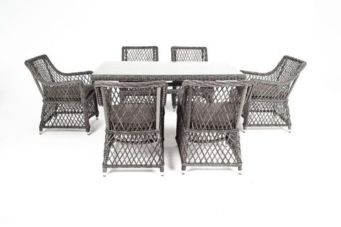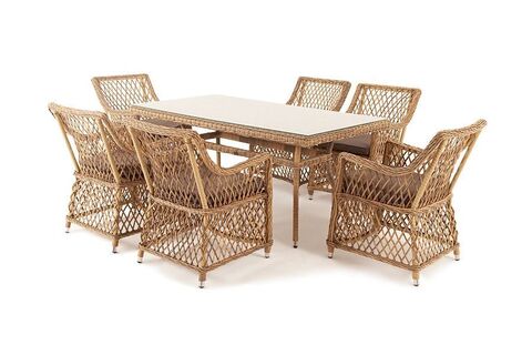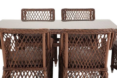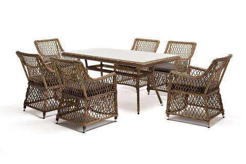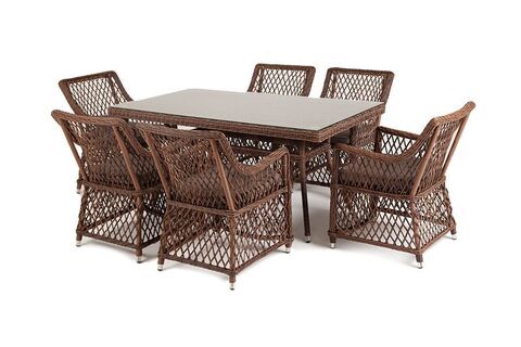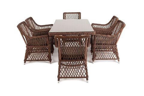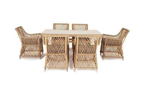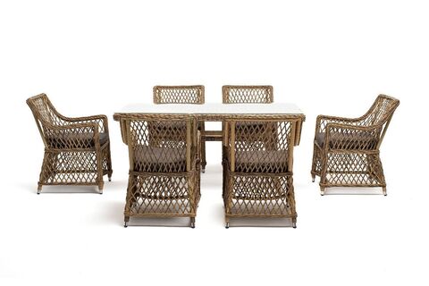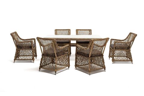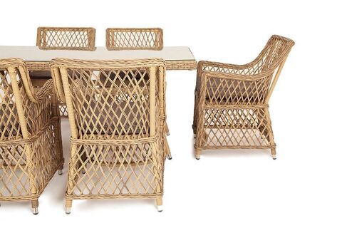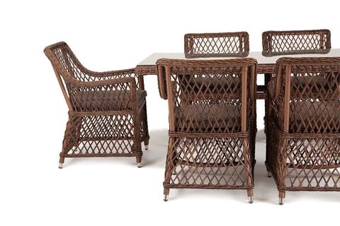 Обеденная группа из искусственного ротанга: 1 прямоугольный обеденный стол со стеклянной столешницей, 6 кресел. Алюминиевый каркас, круглый искусственный ротанг, ручное плетение. Кресла оснащены подушками со съемными чехлами.