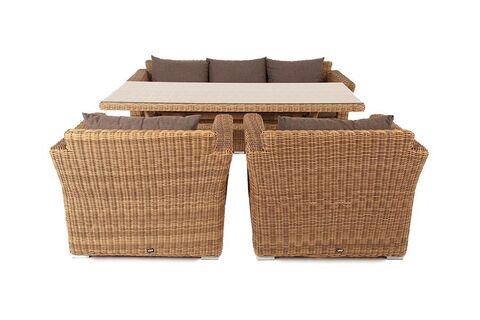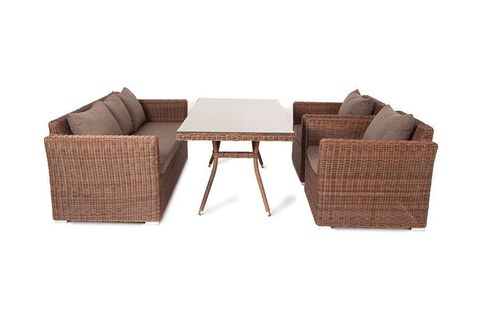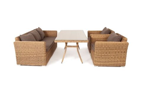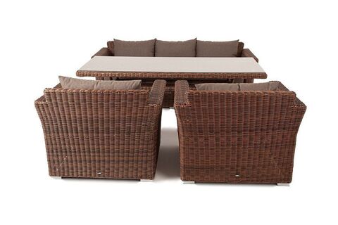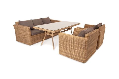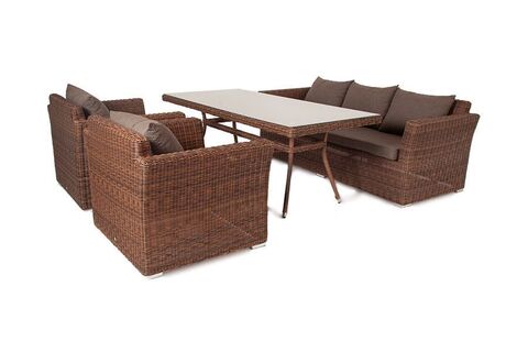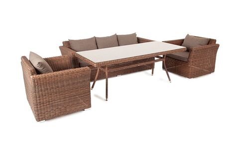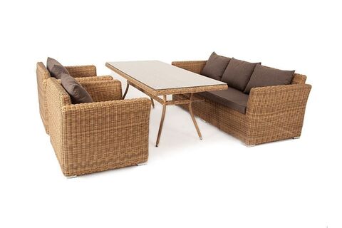 Обеденная группа из искусственного ротанга: 1 трехместный диван, 2 кресла и обеденный стол со стеклянной столешницей. Алюминиевый каркас, круглый искусственный ротанг, ручное плетение. Диван и кресла оснащены подушками со съемными чехлами.