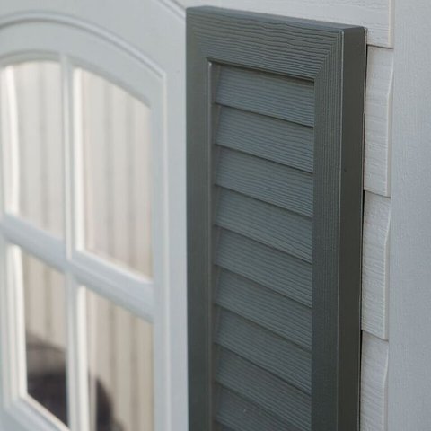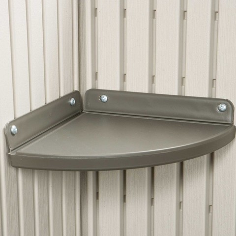Дополнительные аксессуары Сарай комплектуется двумя полками размером 228,6 х 22,86 см, четырьмя угловыми полками , двумя кронштей нами для инструментов и декоративными ставнями