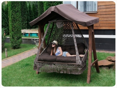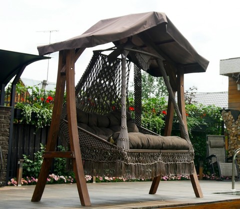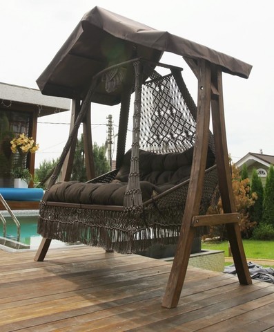 Подвесные качели качели Баунти – это, прежде всего необычный дизайн! Подвесные качели можно закрепить конструкцией верхним креплением или подвесить на надежный деревянный каркас.Каркас для плетеных качелей Баунти сделан из дерева, специально создавался дизайнерами для подвесных качелей Баунти. Особенная деталь каркаса – это необычная крыша с чехлом и небольшой красивой плетеной бахромой наверху. Такая крыша защитит и от яркого солнца и непогоды, поэтому каркас идеально подходит для эксплуатации в различных погодных условиях, не боится жары, холода, влажности. Легкая сборка, пропитка дерева, прочность и оригинальность конструкции позволяют отдыхать с максимальным комфортом.