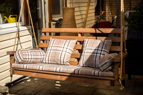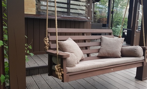 Дерево намного теплее чем обычный металл, оно лучше гармонирует с естевственной природой и хорошо украшает участок. Подушки для данной модели идут в комплекте (цвет уточняйте).