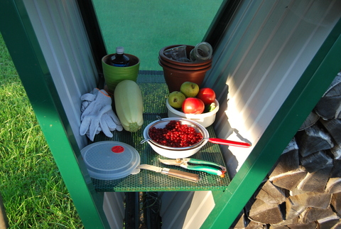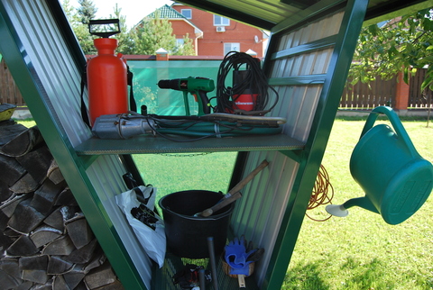 - Удобнее в эксплуатации, чем сарай. Чтобы пользоваться инвентарем не требуется входить и выходить, соответственно не надо заботиться об уборке полов. Поскольку весь инвентарь надежно укрыт от дождя и других осадков, но одновременно находится под вашим взглядом, то не требуется время для поиска нужной вещи, она всегда под рукой. Благодаря секторам и подвесам для каждой вещи определено свое собственное место. Ходить и искать нужную вещь вам уже никогда не придется. Таким образом, порядок в хранении создается сам собой, что организует и ускоряет вашу работу.