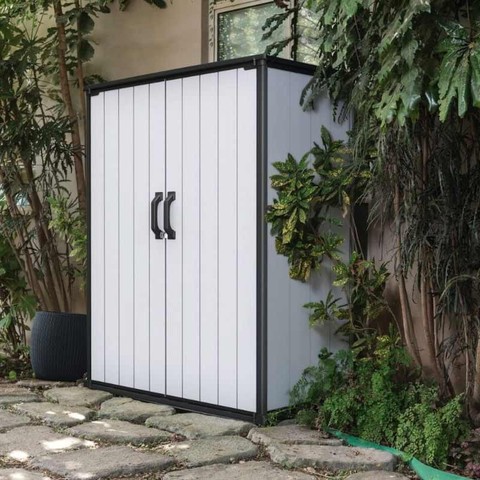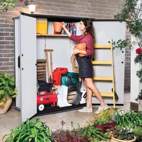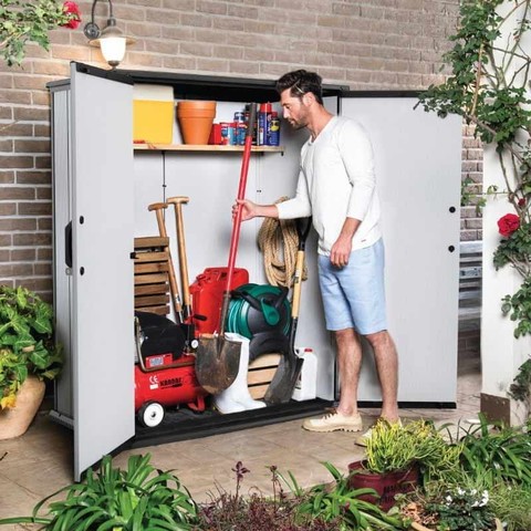 Шкаф для хранения садового инвентаря Keter Premier High Store 1400 L очень удобен в использовании. Он имеет открывающиеся створки на специальных петлях из нерж. стали, что позволяет с максимальным удобством размещать в нем габаритный, тяжелый инвентарь в загородном хозяйстве. Что весьма немаловажно шкаф укомплектован полом с особым наклонным порожком.
