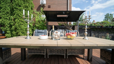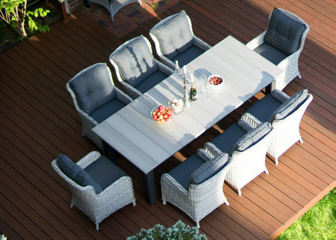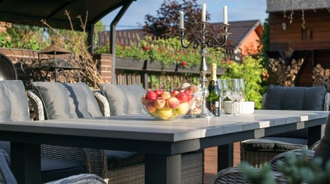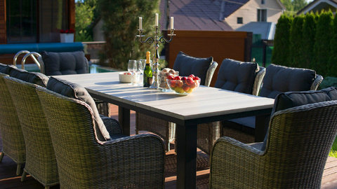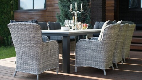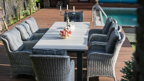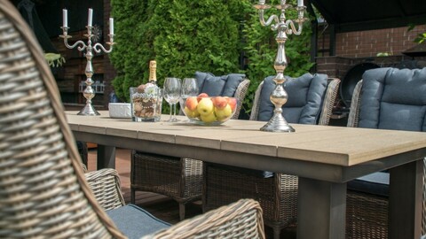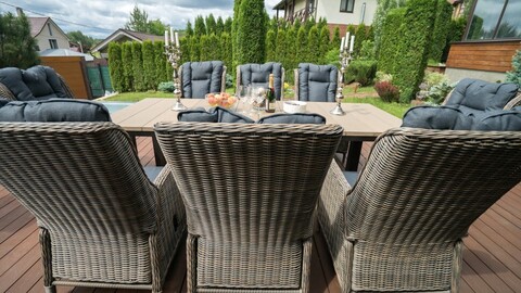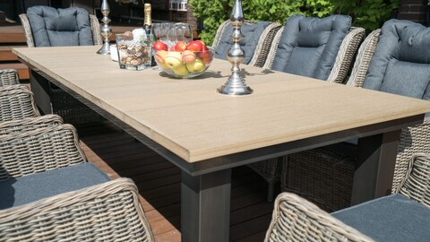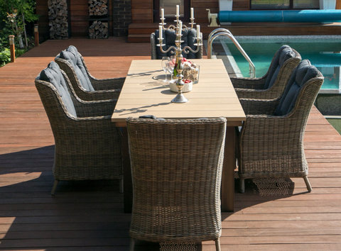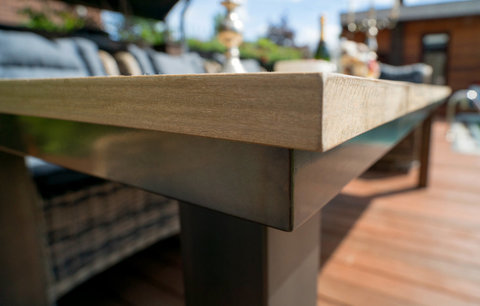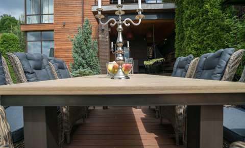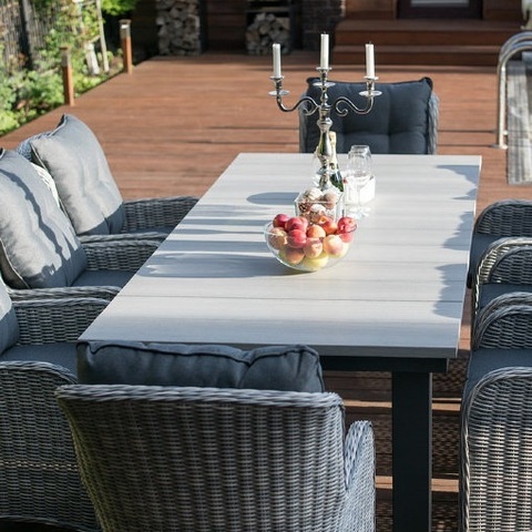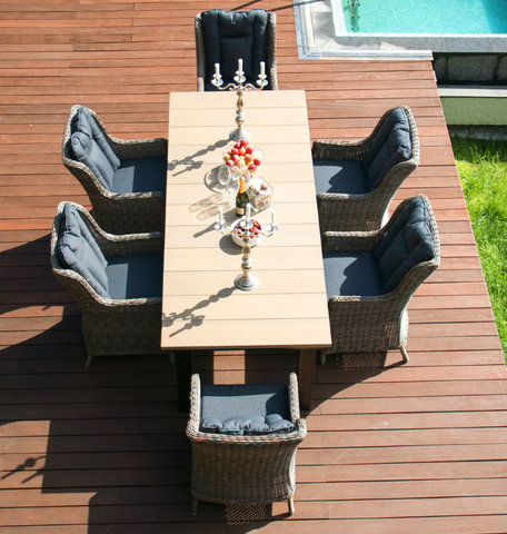 Большой стол ПАРКЛЭНД - имеет красивую текстуру дерева, но по всем свойствам превосходящим его устойчив к воздействию ультрафиолета не растрескивается и не деформируется, влагоустойчивый, что делает его незаменимым при изготовлении столешницы толщина одной панели 3 см. фактура данной столешницы дерево тик!