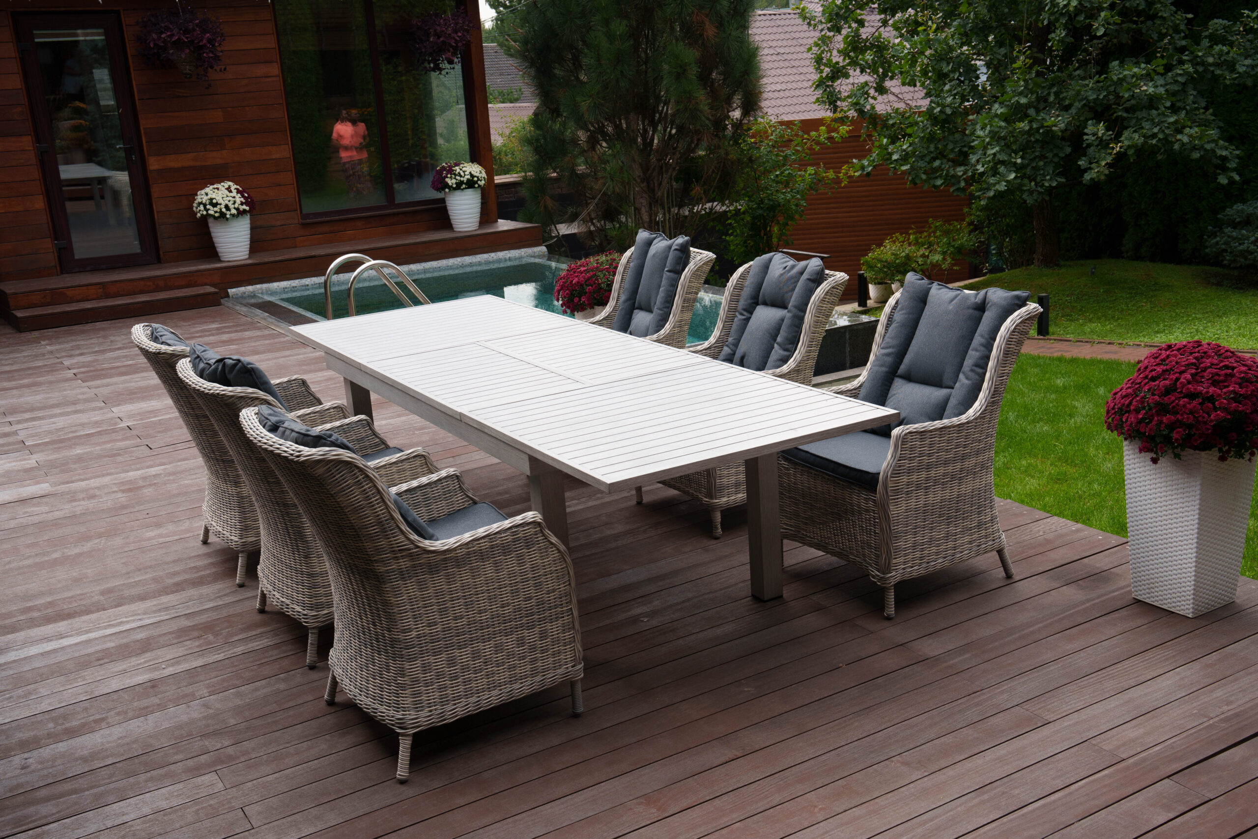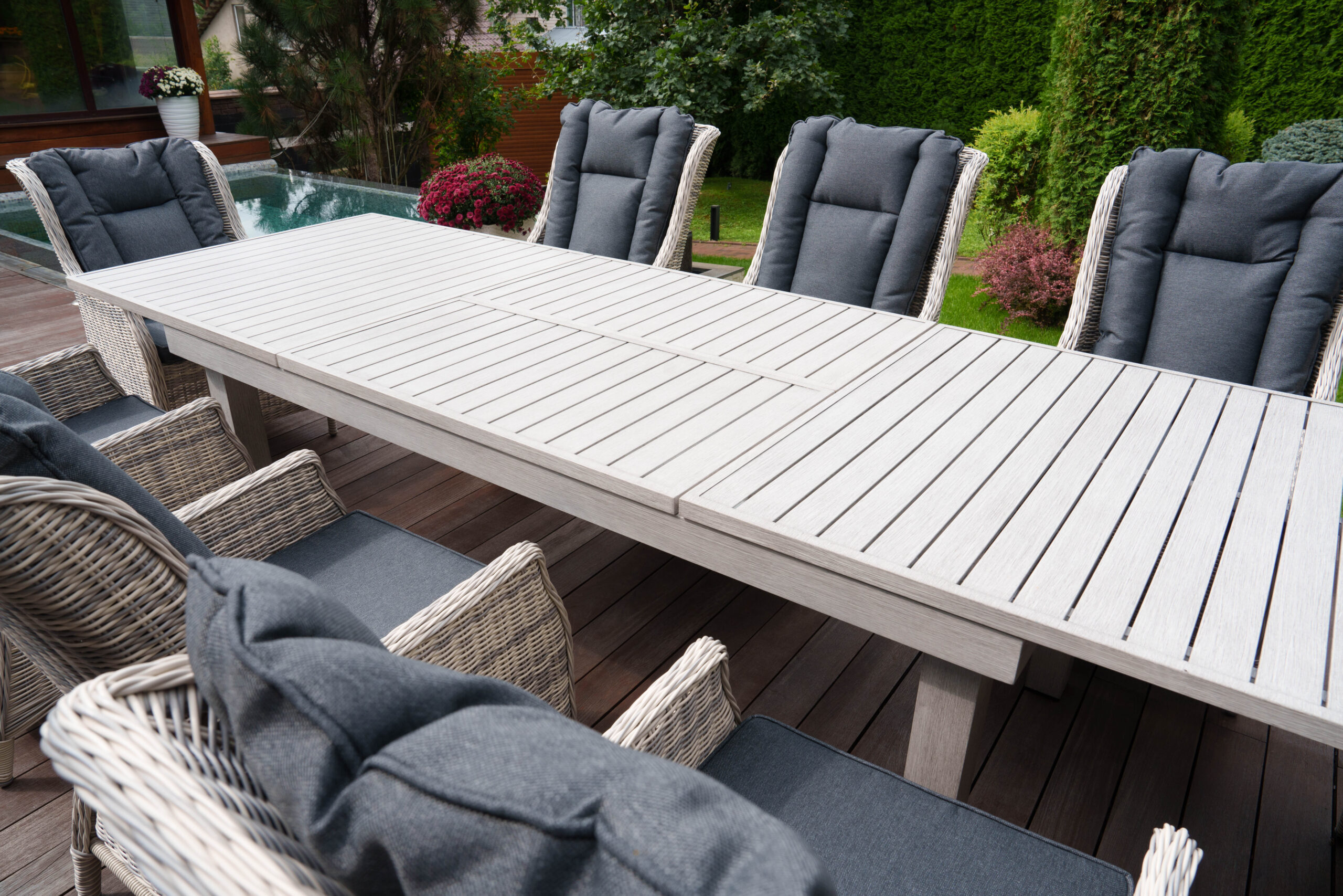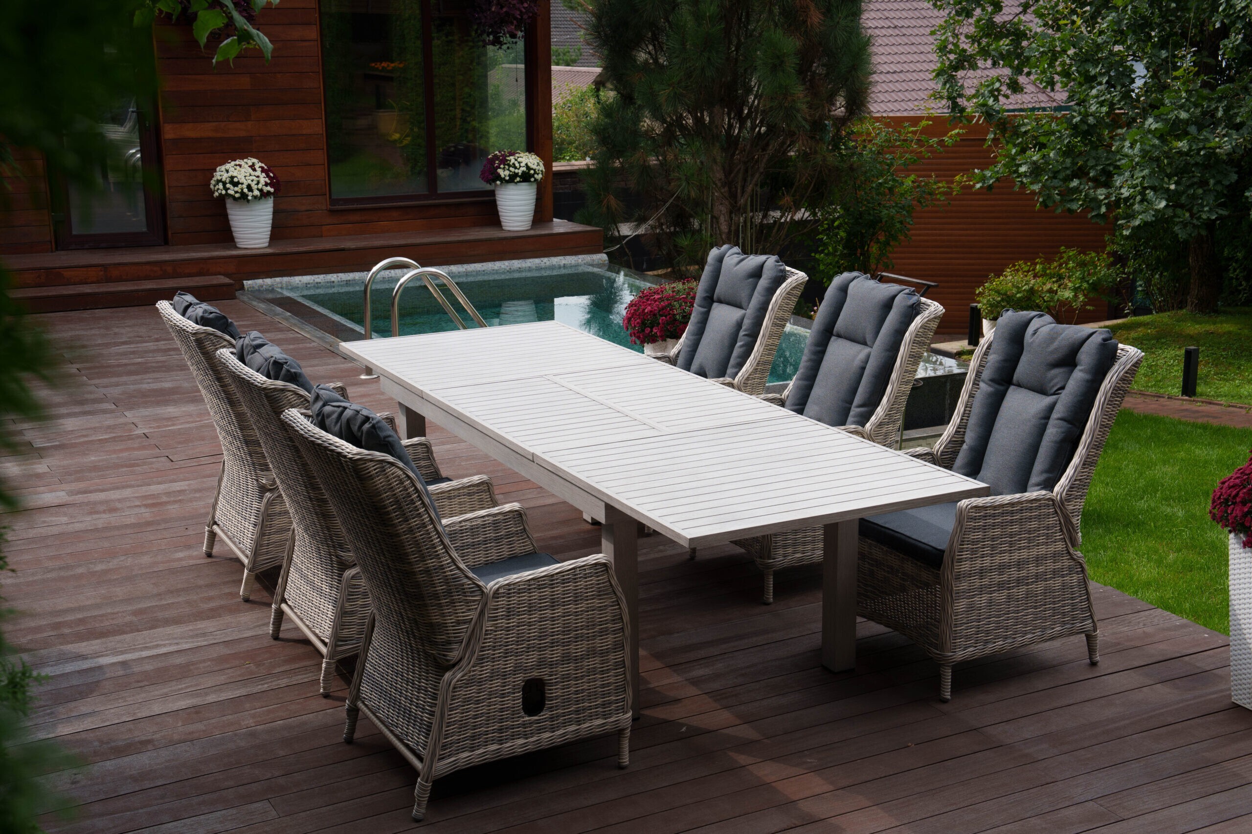 Стол легко и просто раскладывается за счет вставки в центре, изготовлен из алюминия, отличается легкостью и прочностью! Стол ГАРДА можно устанавливать в самых разнообразных местах: на летних верандах, садовых площадок и под открытым небом – ему нипочем капризы природы