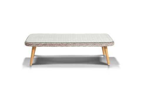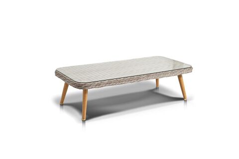 Алюминиевый каркас имеет цвет натурального дерева. Столик дополняет декоративная оплетка, при изготовлении которой используется искусственный ротанг. Она представлена в светло-сером оттенке.