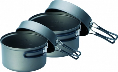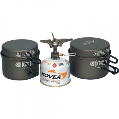 Туристический набор легкой походной посуды из анодированного алюминия, рассчитанный на 1 - 2 человек. Набор состоит из двух котелков объемом 1.2 литра и 0.8 литра. Анодированный алюминий обладает повышенной теплопроводностью, в связи с чем пища готовится значительно быстрее. Материал так же показывает прекрасную устойчивость перед окислением, даже во время длительной эксплуатации. В комплекте к набору посуды сразу поставляется газовая горелка TKB-0707 Supalite Titanium, которая работает от баллонов Kovea резьбового стандарта.