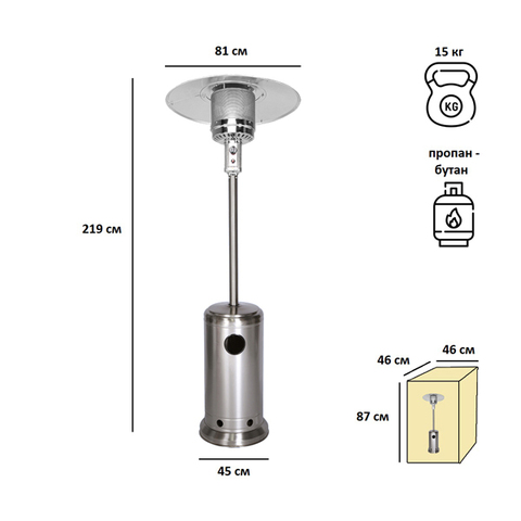 Уличный газовый обогреватель AESTO A-02 (нержавеющая сталь) имеет отличные габариты — высота конструкции чуть более 2 метров, диаметр отражателя, установленного в верхней части модели, около 80 сантиметров, а вес, ни много ни мало, 15 килограмм — все эти качества делают устройство компактным и портативным.