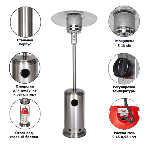 Основным преимущество уличного газового обогревателя AESTO A-02 (нержавеющая сталь) является его стальной, нержавеющий корпус, который имеет минимальный срок износа, а качество и крепость конструкции — основная изюминка модели. Создавайте в своем саду невероятную домашнюю атмосферу с уличным газовым обогревателем AESTO A-02 (нержавеющая сталь), без дополнительного обслуживания и с максимальной теплоотдачей, не волнуясь за качество и долговечность устройства!