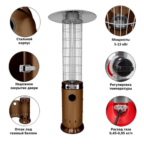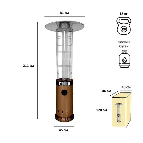 Обогреватель представляет собой пирамиду с пламенем в корпусе. Высота пламени плавно регулируется и может доходить до одного метра в высоту. В основании пирамиды размещен баллон с газом. Обогреватель выполнен из прочных и долговечных материалов.