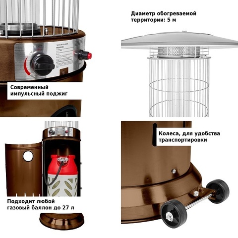 В конструкции используется специальный шланг для присоединения к газовому баллону ёмкостью до 27 литров.