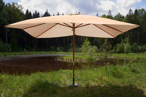 Изделие устанавливается на пляже, около бассейна, на даче или в кафе. Такой зонт обеспечит не только затенение сразу нескольких столиков в летнем кафе или нескольких шезлонгов на пляже, но и станет прекрасным украшением, приносящим эстетическое удовольствие от времяпрепровождения.