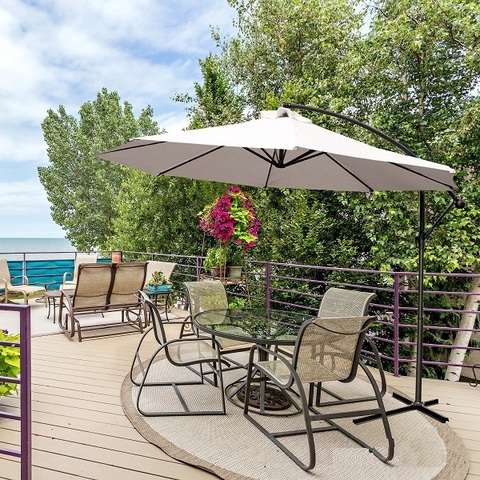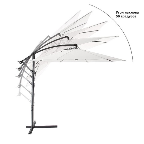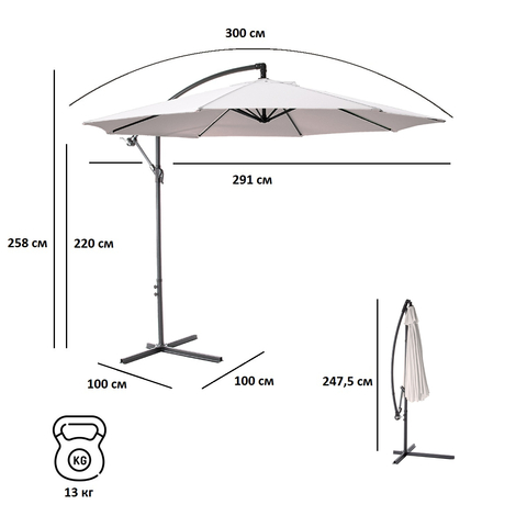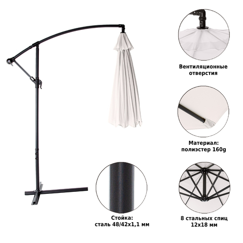 В комплекте с зонтом идет основание – крестовина, на которую для устойчивости можно установить бетонные утяжелители (в комплект не входят) или привернуть ее через имеющиеся отверстия к полу.